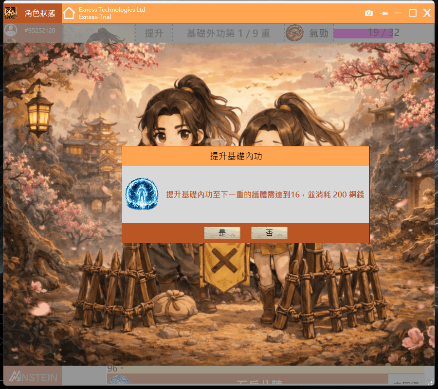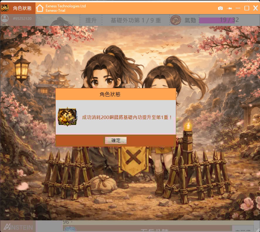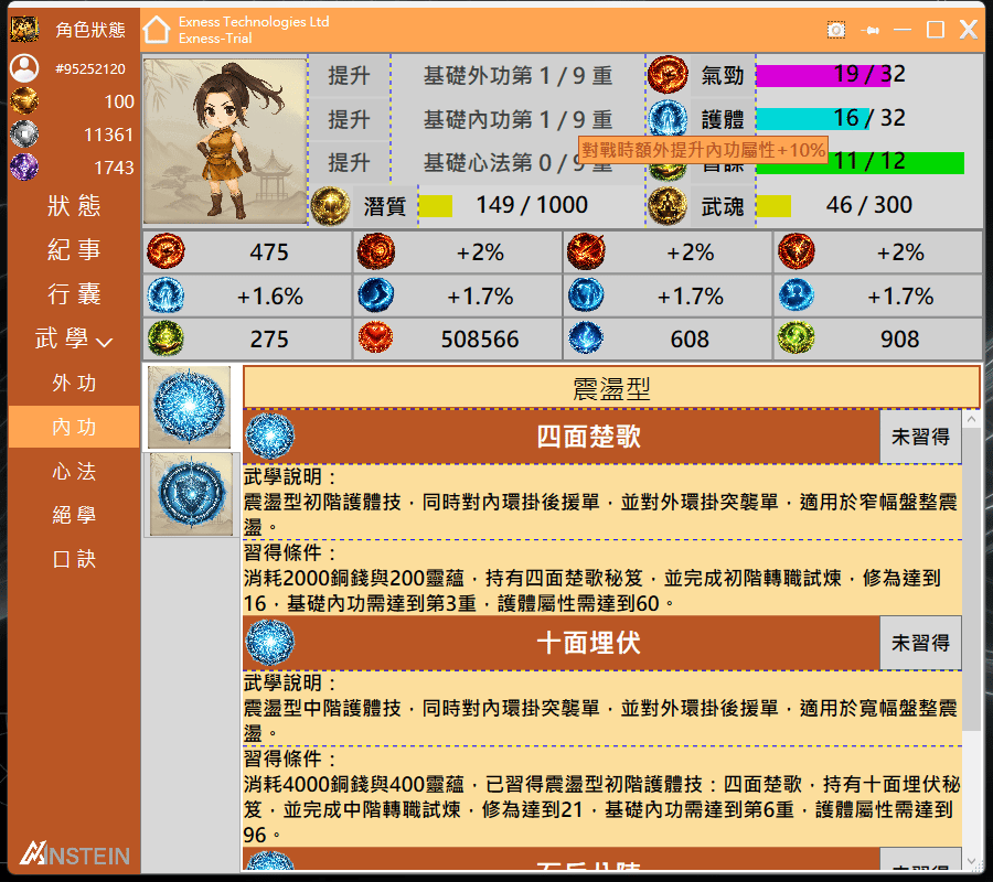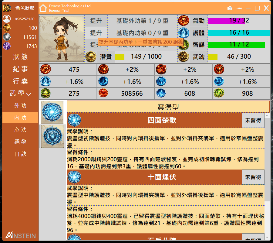 在角色狀態面板消耗靈蘊提升護體屬性至16,並消耗200銅錢,將基礎內功提升至第1重。