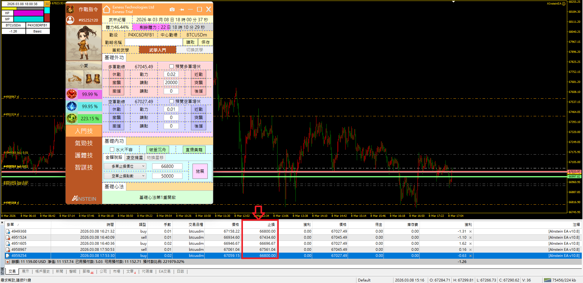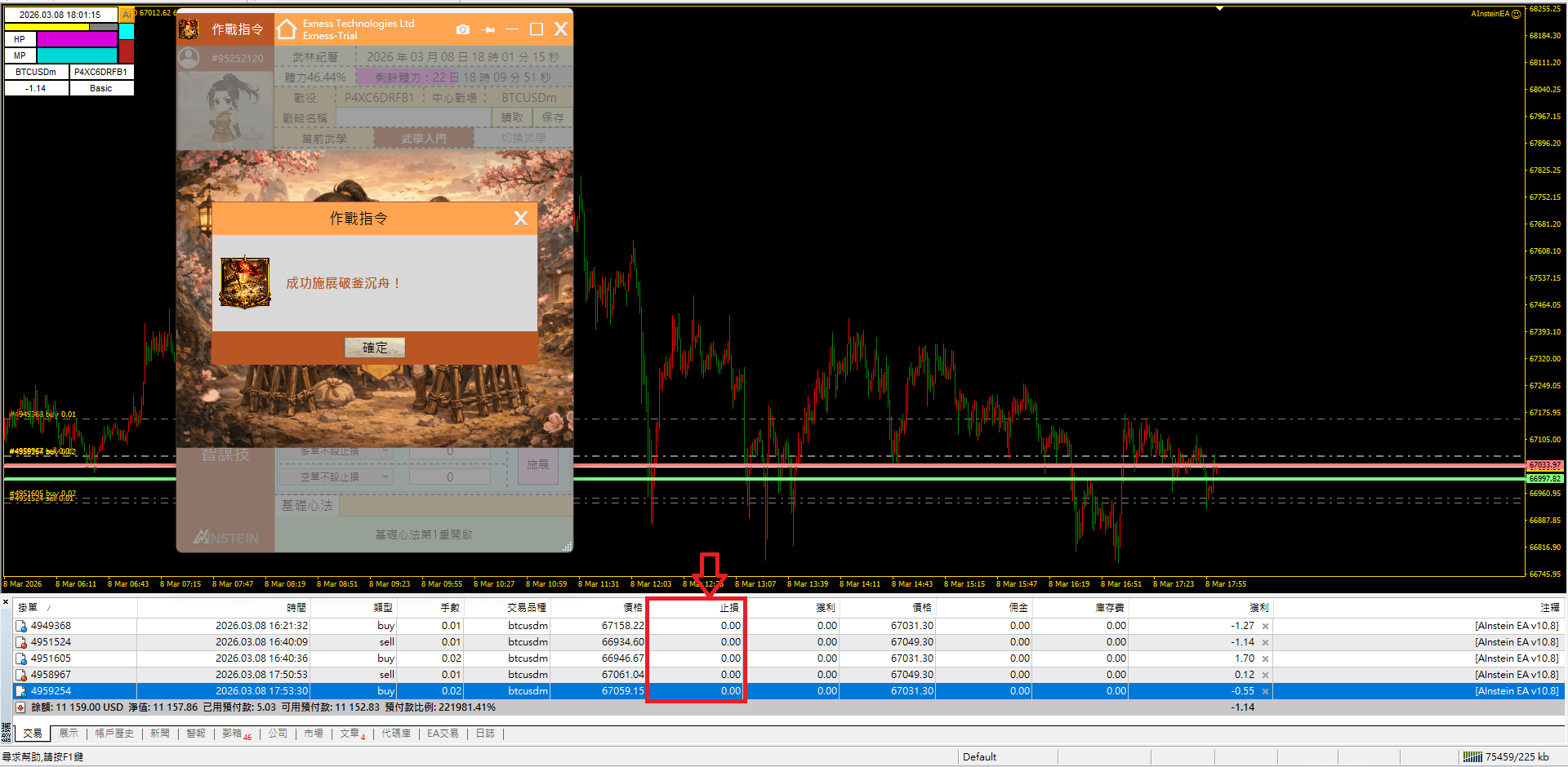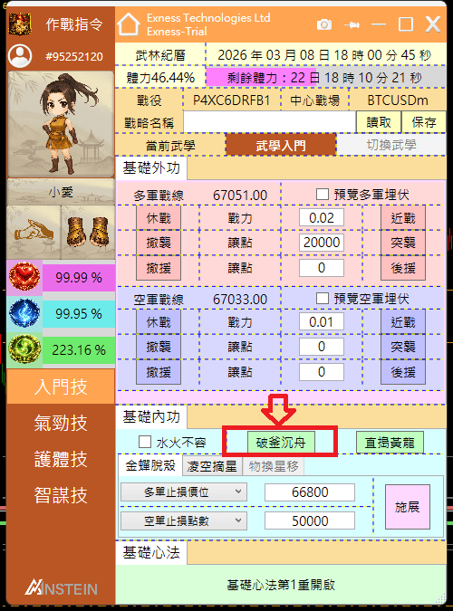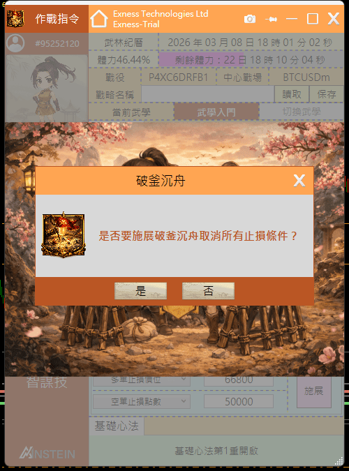 是啊!在瞬息萬變的行情下,若要對逐筆訂單重置止損位置的確是缺乏效率!因此當我們修為達到8級以後,可以施展基礎內功的「破釜沉舟」,來對當前圖表交易品種的所有多單與空單取消止損。