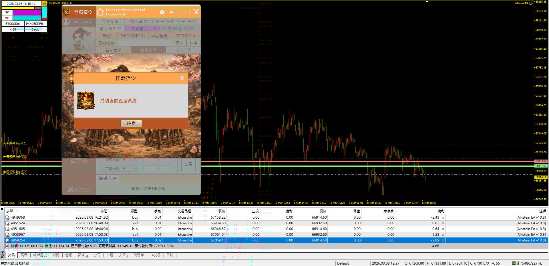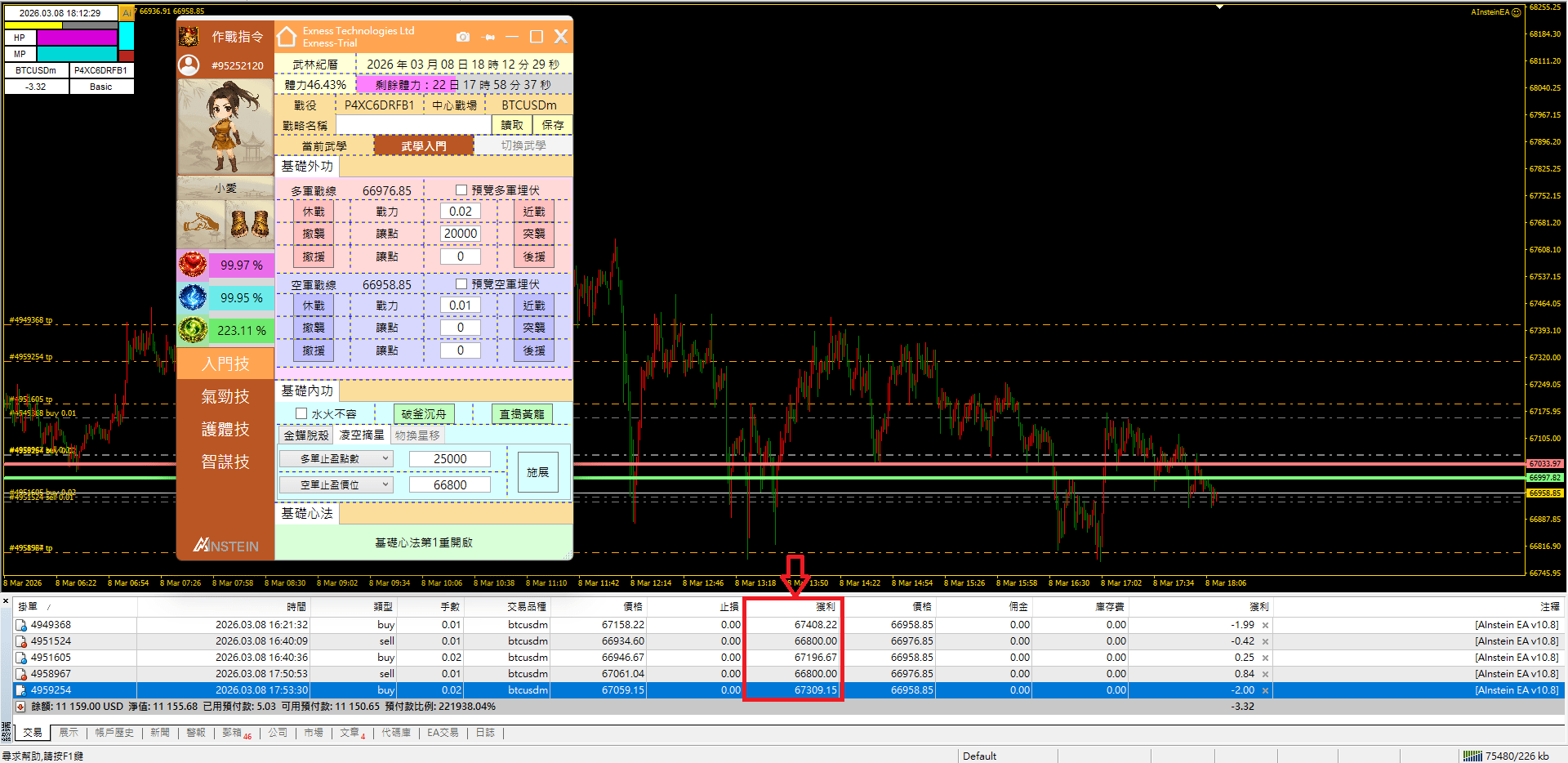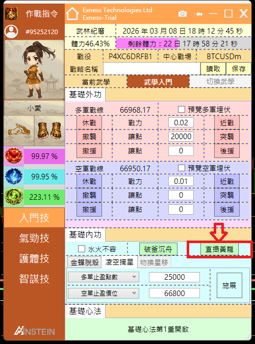 是啊!在瞬息萬變的行情下,若要對逐筆訂單重置止盈位置的確是缺乏效率!因此當我們修為達到8級以後,可以施展基礎內功的「直搗黃龍」,來對當前圖表交易品種的所有多單與空單取消止盈。