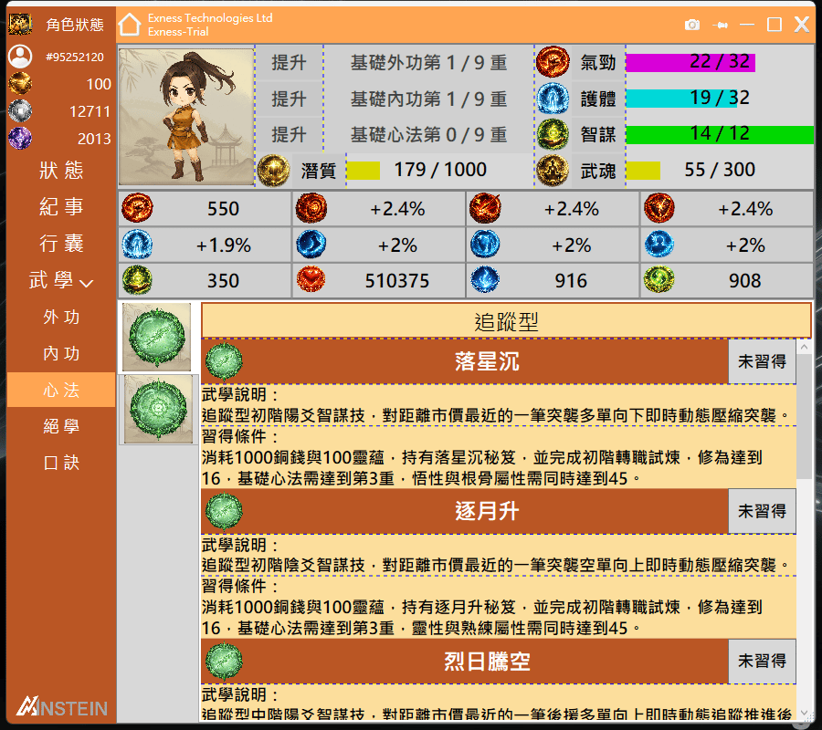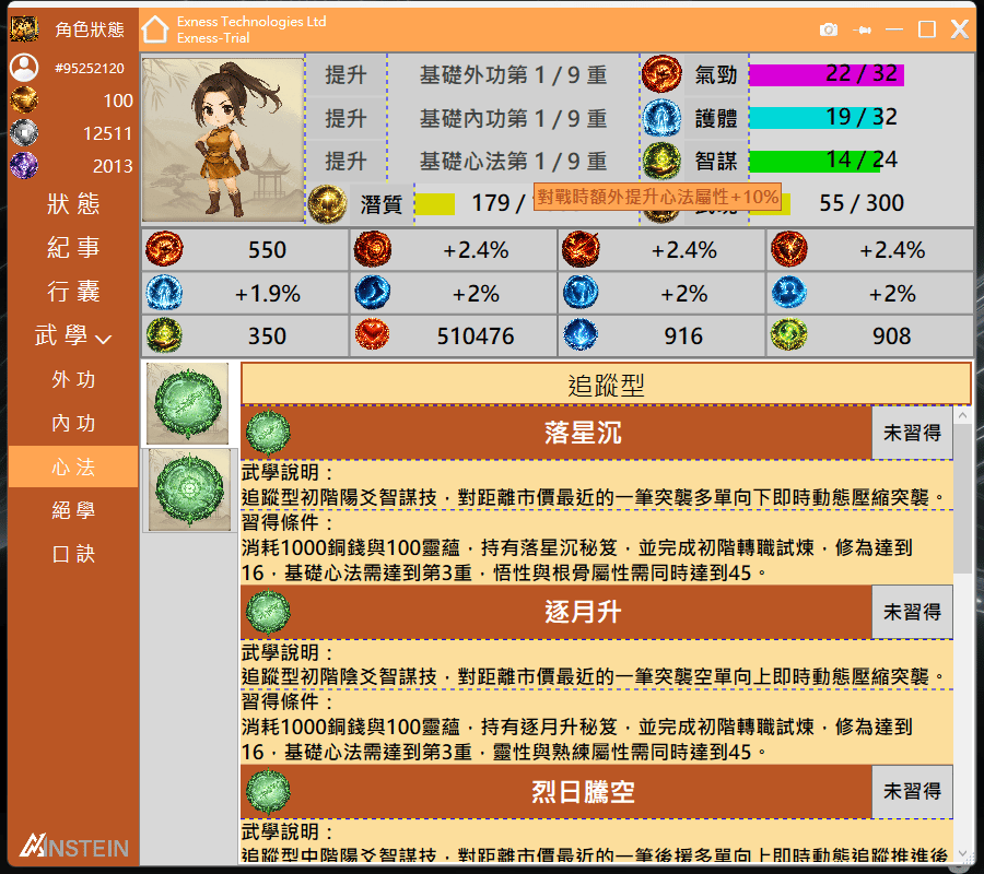 在角色狀態面板消耗靈蘊提升智謀屬性至12,並消耗200銅錢,將基礎心法提升至第1重。