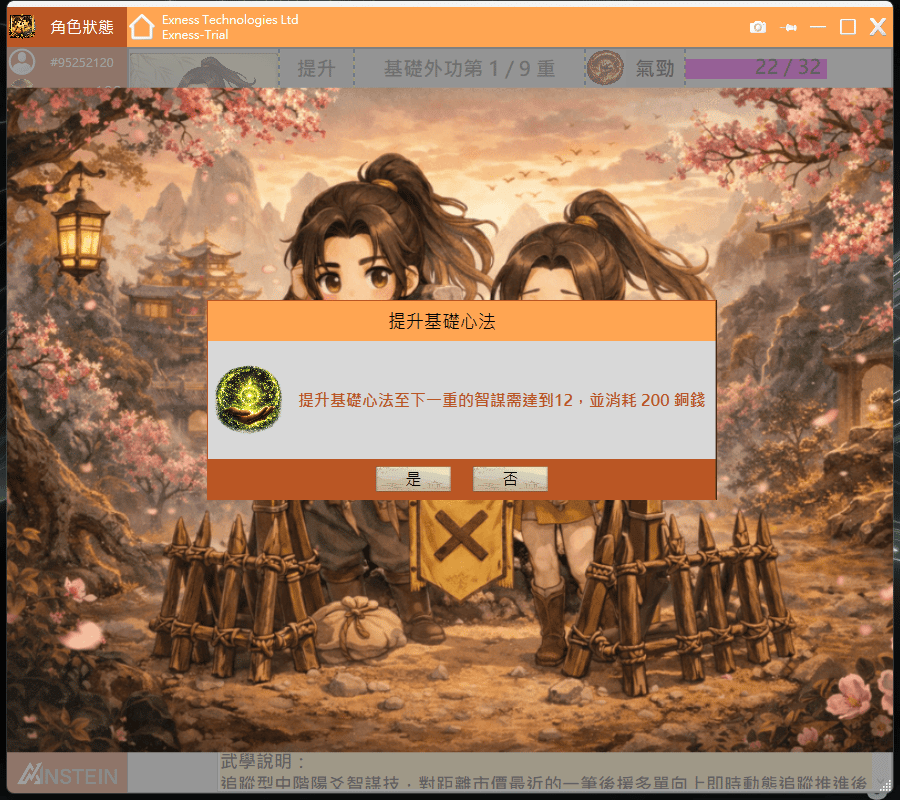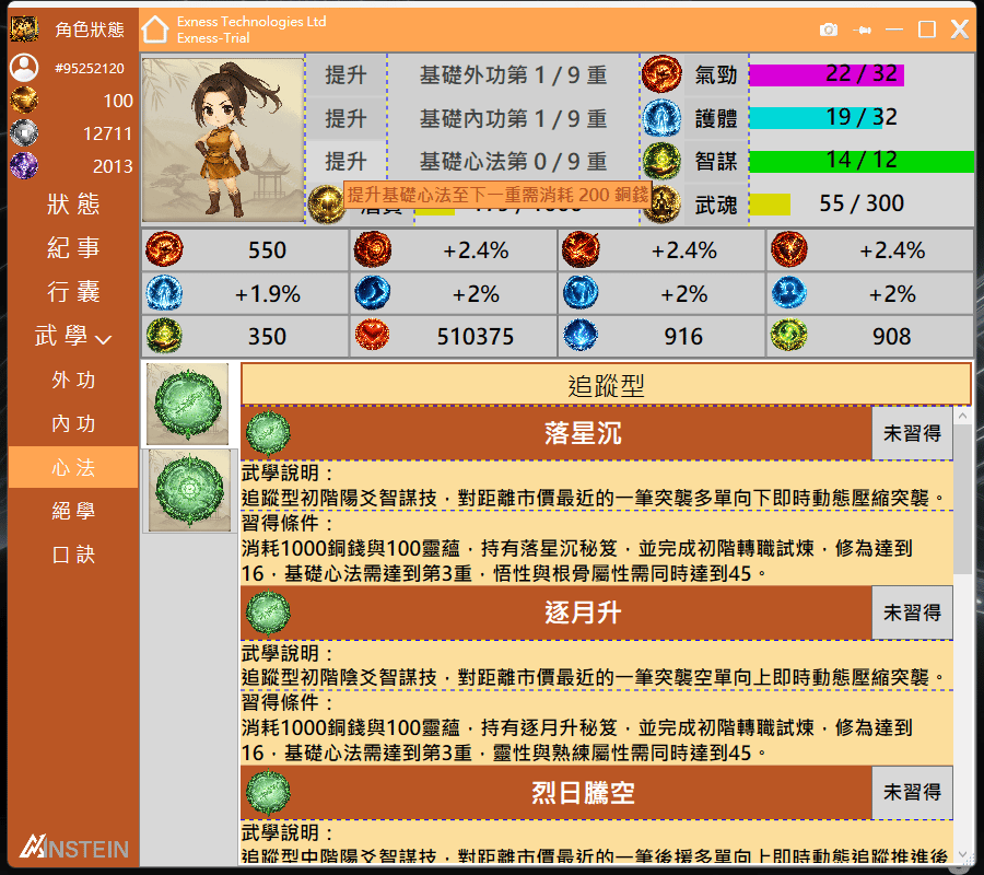 當智謀屬性達到12後,可以消耗200銅錢將基礎心法提升至第1重。