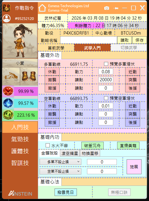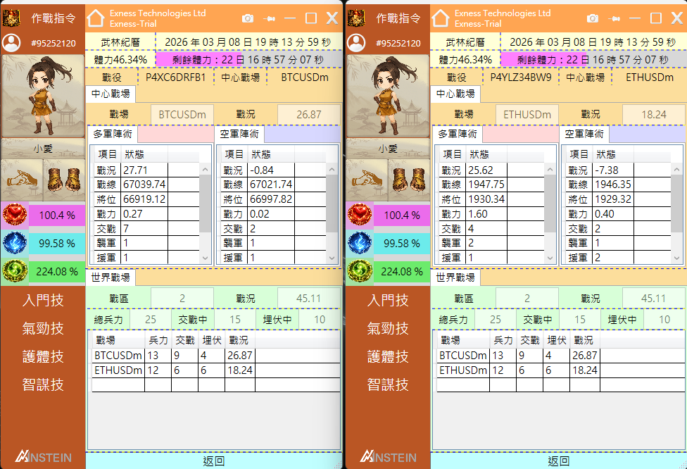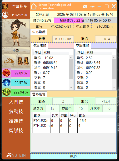 「中心戰場」顯示的是我們當前圖表交易品種的資訊,分為「多軍陣術」與「空軍陣術」,我由上至下依序來說明每個欄位的意思: